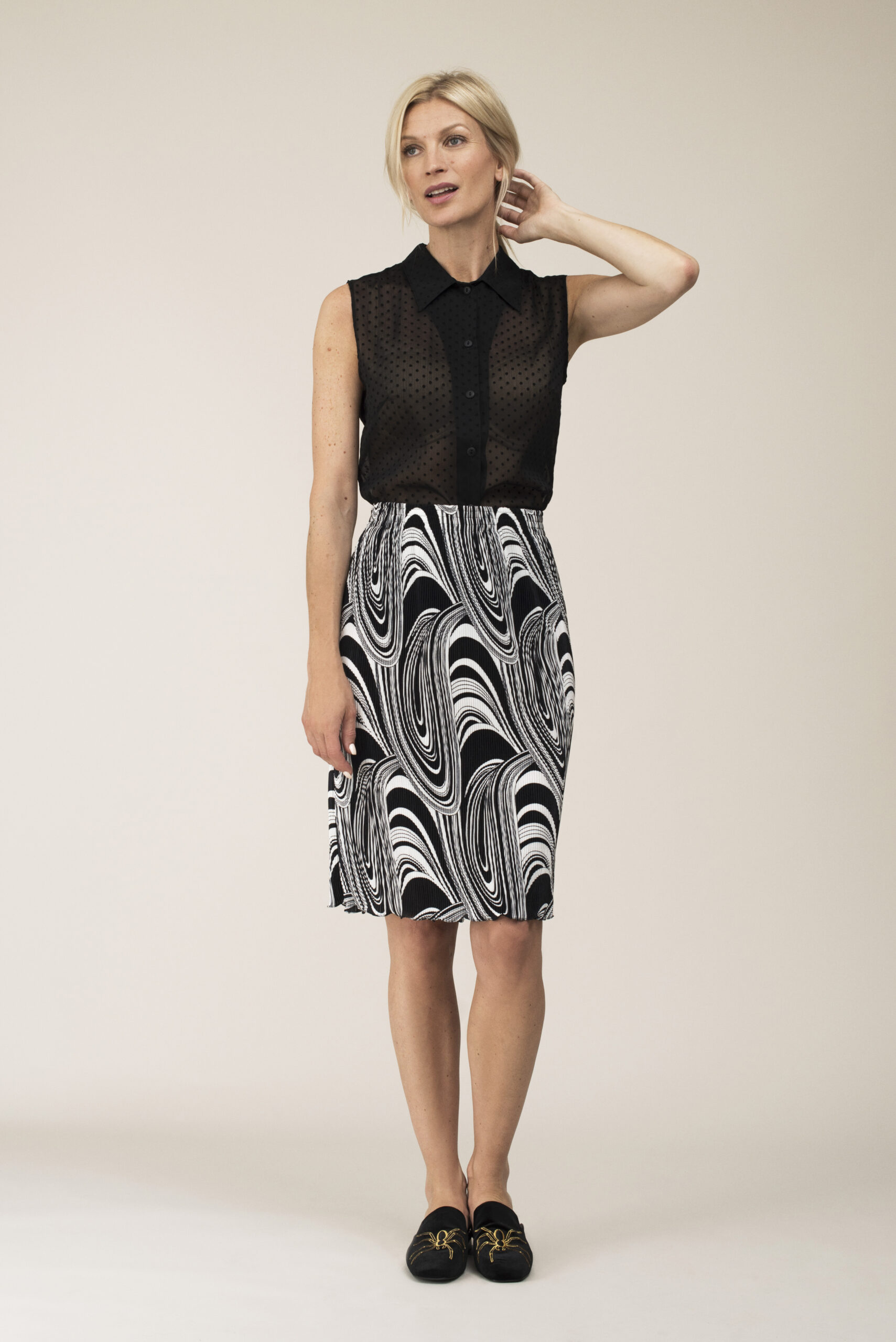 Naisten mustavalkoinen pliseerattu hame, jossa on kuminauhavyötärö. Kankaan pliseeraus antaa mukavasti joustoa leveyssuunnassa. Erittäin helppo pukea päälle. Hameessa on näyttävä graafinen kuviointi ja se on malliltaan suora ja vuoreton.