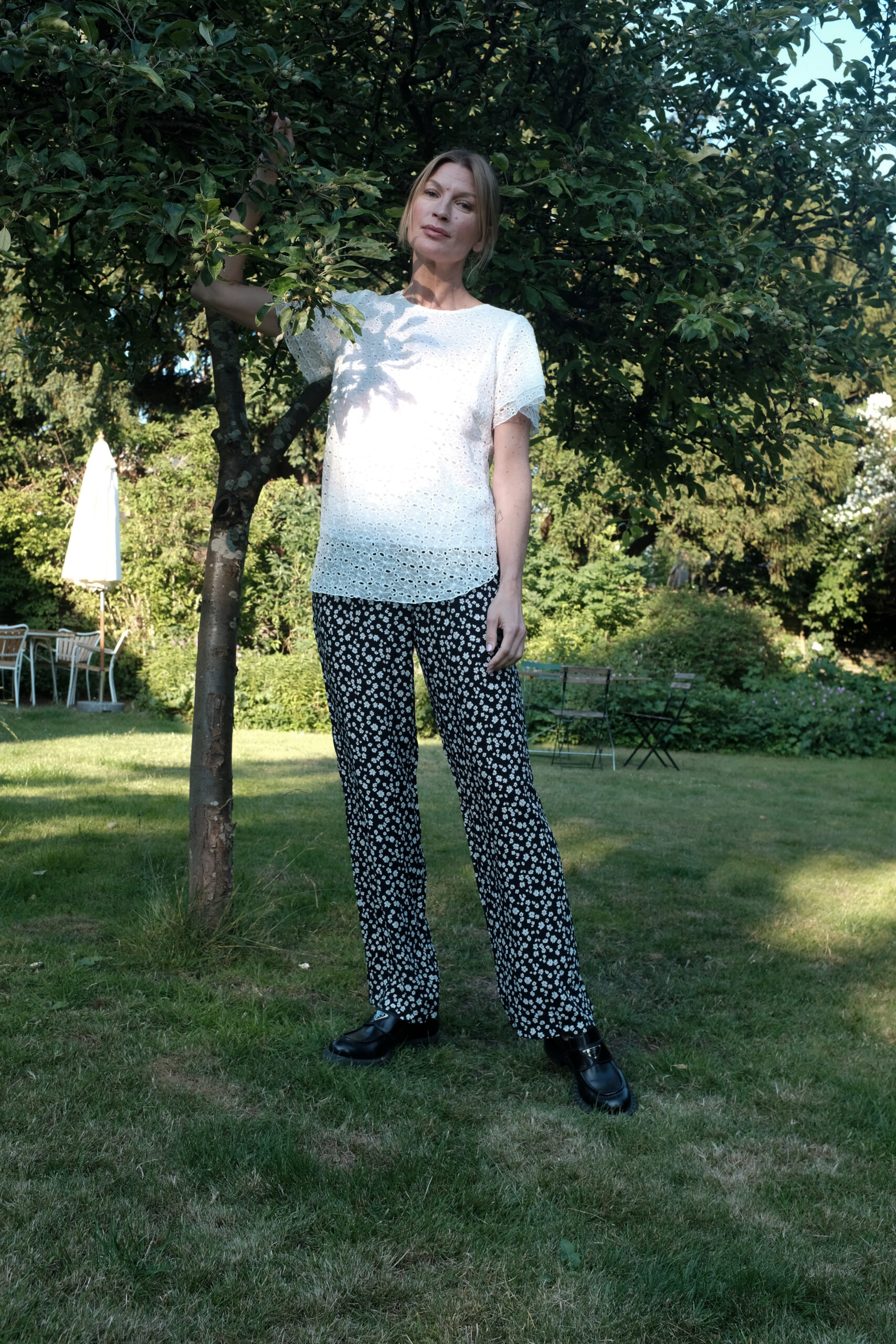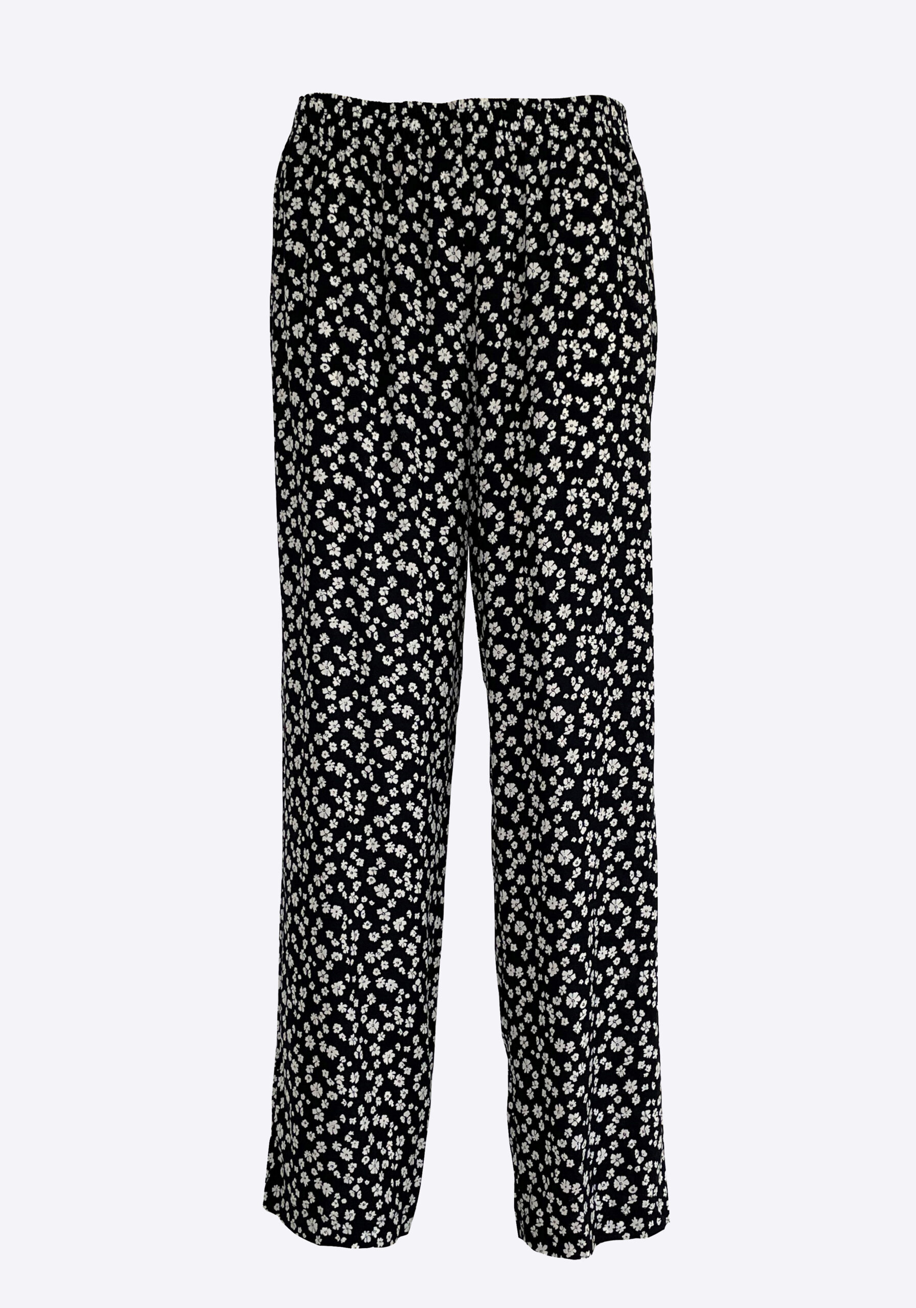 Naisten mukavat ja ihanan kevyet viskoosihousut. Housussa on väljä mitoitus ja suorat lahkeet. Kuminauhavyötärö lisää käyttömukavuutta ja tekee housusta helpot pitää. Housujen pohjaväri on musta ja kankaassa on kaunis valkoinen pieni kukkakuviointi. Helpot housut yhdistää erilaisten puserojen kanssa.
