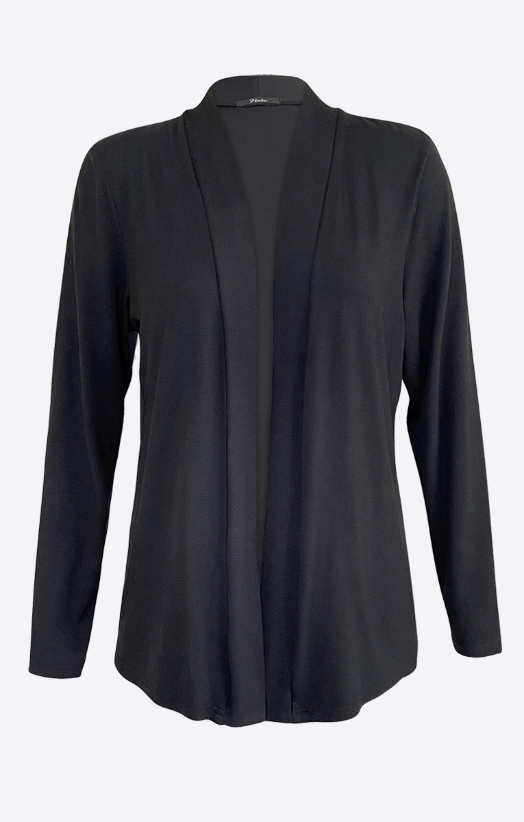 Naisten kevyt musta trikoojakku, jossa täyspitkät hihat. Ajaton trikoojakku on laadukasta ja joustavaa viskoosi-elastaanineulosta. Kauniisti laskeutuva ja miellyttävä päällä. Helppo vaate.
