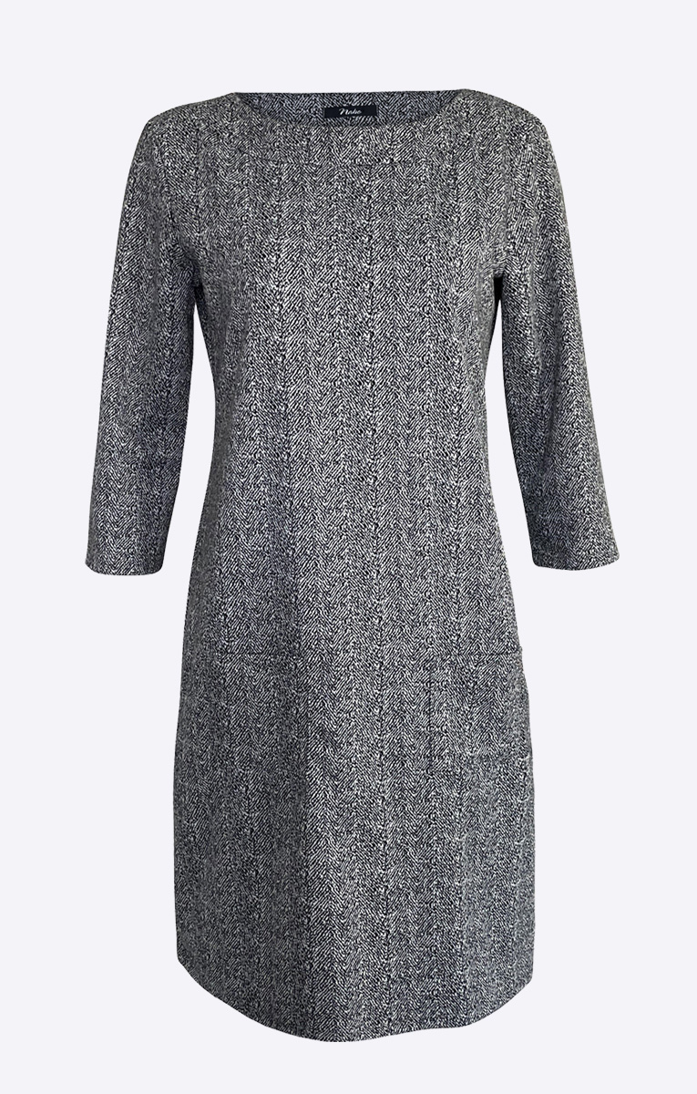 Naisten mustavalkoinen mekko, jossa hillitty kalanruotokuviointi. Edessä on käytännölliset  ja kivat paikkataskut. Ryhdikkäässä, mutta joustavassa mekossa on ovaalin muotoinen pääntie ja vajaamittaiset hihat. Materiaali on laadukasta ja tukevaa neulosta. Helppo ja monikäyttöinen mekko erilaisiin tilaisuuksiin.