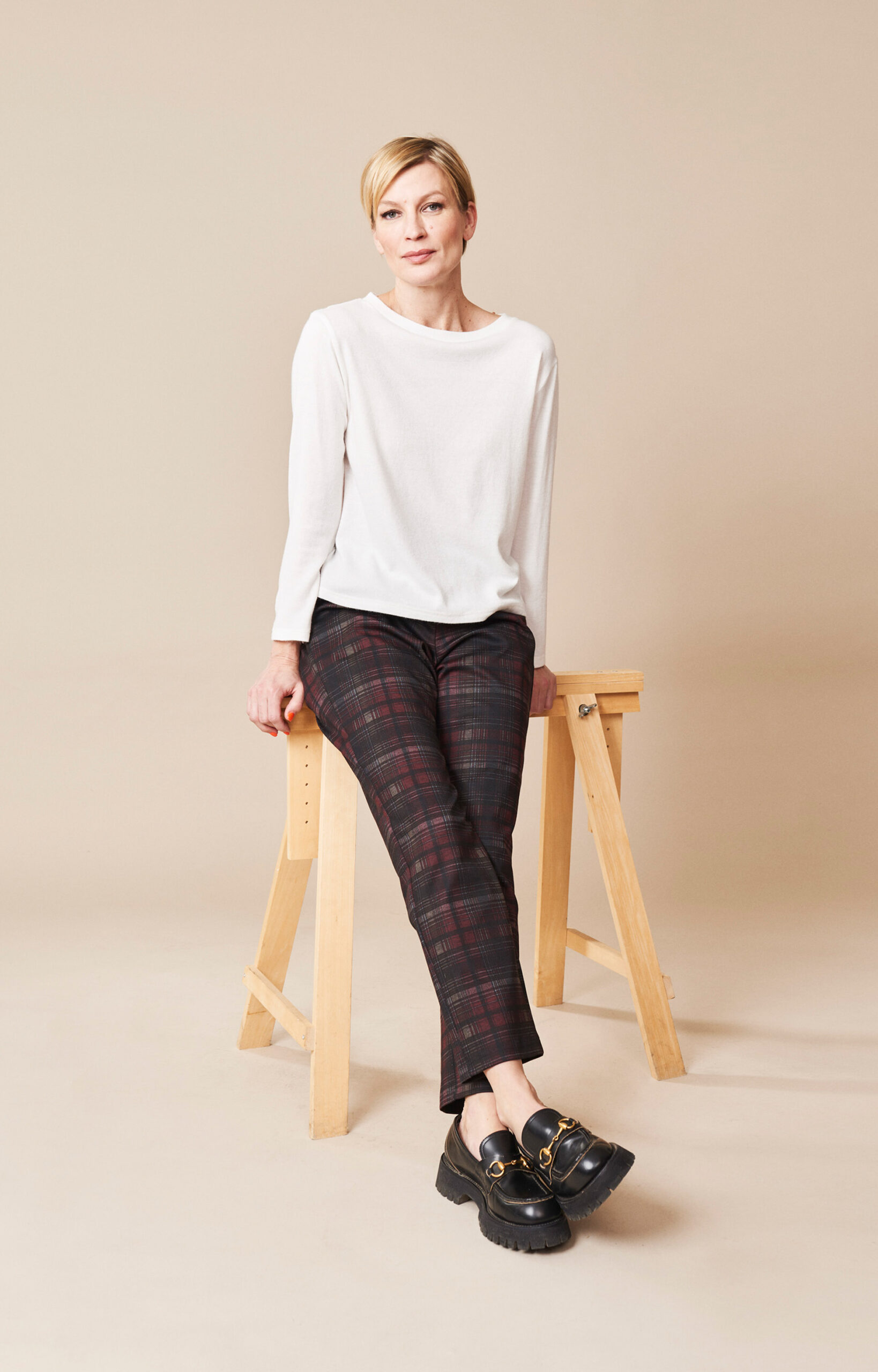 Naisten klassisen tyylikkäät ja joustavat ruutukuvioiset housut. Kevyesti joustavan housun vyötäröä ympäröi kuminauha, joka lisää käyttömukavuutta. Housussa on täyspitkät lahkeet sekä vinotaskut. Housut on laadukasta ja siistinä pysyvää materiaalia. Ruutukuvioisessa kankaassa on mustaa, harmaata ja viininpunaista väriä.